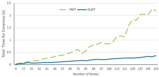 32]. Moreover, with the increasing number of nodes participating in the PBFT algorithm, the system becomes safer, but the delay will be longer [