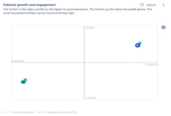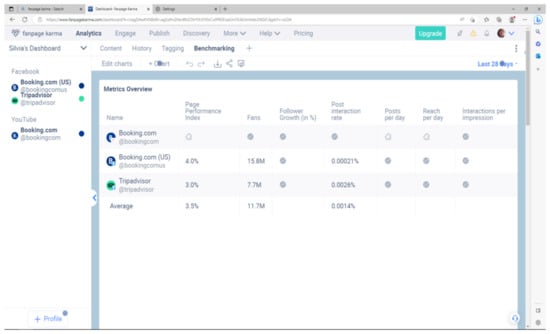 This tool also allows visualizing several metrics such as number of followers in a competitor’s page, its growth rate, engagement, response time, influencers, etc. Since it returns the results in a friendly design (including charts), their comparison is much easier. This is very interesting because the information about the competition’s strategic options can be more easily discerned and understood. Moreover, this big source of unstructured data can then be accessed and used for deeper analyses of behavioral patterns and trends that went unnoticed before []. Currently in FpK there are more than 350 different metrics to choose and arrange in a dashboard, including the websites that can be added to it (Figure 3).