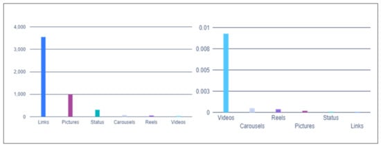 Therefore, this first scraping query shows at least two things: that more metrics are needed to understand these issues and that tourists/visitors engage more with visual social media (rich in pictures, short videos, and storytelling). This trend is augmenting what requires more experience to be prepared for future VR (virtual reality) or AI-based tourism/hospitality projects. Then, we pursued the analysis to discover which specific content got the most engagement from users. This information is important in order to change or improve campaigns and product/service innovation. Figure 5 shows which post features were published the most (left side of chart) and which ones had the most interactions (right side of chart) according to the following categories: links, pictures, status, carousels, reels, and videos.