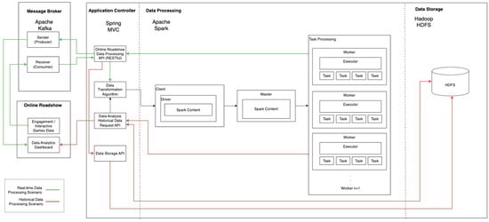 A big data processing framework for the Online Roadshow should be capable of working in dual-mode (red line is the Historical Data Processing scenario and green line is the Real-time Data Processing scenario) to analyze responsive (real-time) and batch (historical) data concurrently. It needs to serve different purposes that require faster and slower responses. For example, real-time big data processing provides a more accurate personalized targeted advertising experience, while historical data processing provides highly efficient trend analyses. For real-time data processing, the proposed framework leverages Apache Kafka as the message broker to handle the large amount of incoming data on the participant’s preference. Apache Spark is used as the data processor.
