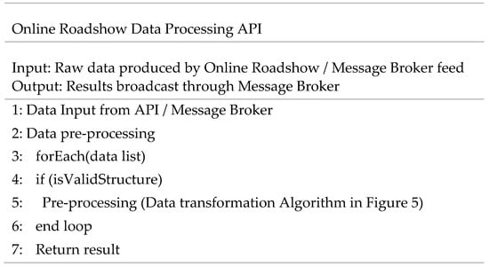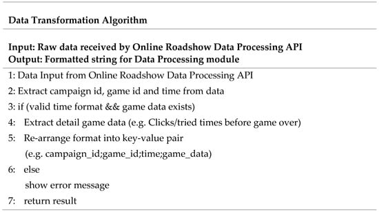 In the Online Roadshow, web engagement and interactive game data such as page visit, gameplay preferences, and gameplay performance data are collected during participant interaction sessions. Thus, the Online Roadshow Data Processing API provides data feed ingestion from the Online Roadshow to the Message Broker module for real-time data input and further processing. The pseudocode of the Online Roadshow Data Processing API is shown in Figure 3. It consumes the data from the message broker and validates the data to ensure a valid semi-structured JSON data format before processing them via the Data Transformation Algorithm, as shown in Figure 4, to transform the data into a key-value pair for the subsequent data extraction process. Invalid data will be ignored and the next record will be processed instead. Then, the pre-processed data will be processed by the Data Processing module and further broadcast to the message broking channel, which allows subscribers in the message broker to retrieve the real-time data processing result while storing the data in the Data Storage module in the background.