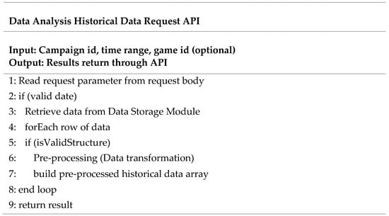 At the same time, historical data ingested from the Message Broker will be stored into the Data Storage module through the Data Storage API, as shown in Figure 5. By analyzing the historical data, advertisers can enhance decision-making efficiency by fine-tuning advertising strategies in the Online Roadshow to facilitate better engagement through providing a personalized web experience. In the case of the historical data retrieval, the Data Analysis Historical Data Request API, as shown in Figure 6, will retrieve the data within the specific requested time frame from the Data Storage module to analyze the overall participant preferences in terms of the sequence of page visit and gameplay behavioral characteristics. After that, the data retrieved will be pre-processed by the Data Transformation Algorithm for further processing by the big data processing module. Finally, the processed data will be returned through the Data Analysis Historical Data Request API to the Data Analytics Dashboard in the Online Roadshow for visualization.