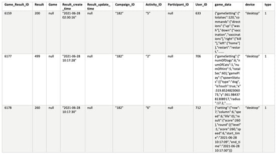 Data were collected for the Online Roadshow in two sessions between 5 July 2021 to 31 August 2021 and 12 July 2022 to 21 July 2022, with a total of 504 participants. A total of 1.97 Gb of Online Roadshow records comprising the participant information, timestamps, gameplay details (e.g., accuracy of the kinesthetic-oriented gameplay and words being used in the audio-oriented game that would help to identify one’s personal preferences) was collected in both campaigns of the Online Roadshow. A snippet of the dataset used in the experiment is illustrated in Figure 7, containing 12 fields that provide a comprehensive view of the game results within the Online Roadshow. These fields include Game_Result_ID, Result, Game, Result_create_time, Result_update_time, Campaign_ID, Activity_ID, Participant_ID, User_ID, game_data, device, and type.