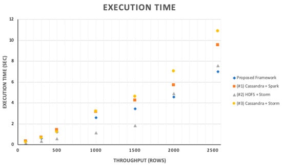 Specifically, this study aims to evaluate the performance of the proposed framework in comparison to 10 existing combinations of big data processing approaches, as listed in Table 5. Among them, combination #1 to #3 simulated the Historical Data Processing scenarios, where data are retrieved from Data Storage module and processed in batches within the specific time range. Apache HDFS and Apache Cassandra were implemented as the Data Storage module. Data were retrieved from the Data Storage module in the different throughputs and passed to the Data Processing module (e.g., Apache Spark and Apache Storm).