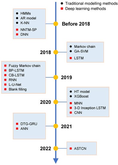 In this section, we introduce the main related work used for the automatic prediction of vehicle speeds. The development trend is shown in Figure 1.