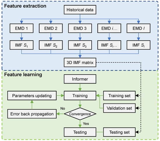 In this section, we introduce the proposed EMD-based informer for vehicle speed prediction. Historical speed data is first decomposed into an intrinsic mode function (IMF) matrix via EMD to enhance its representativeness and then fed into the informer to extract critical features and make predictions for future vehicle speeds. The overall processing flow of the proposed method is shown in Figure 2.