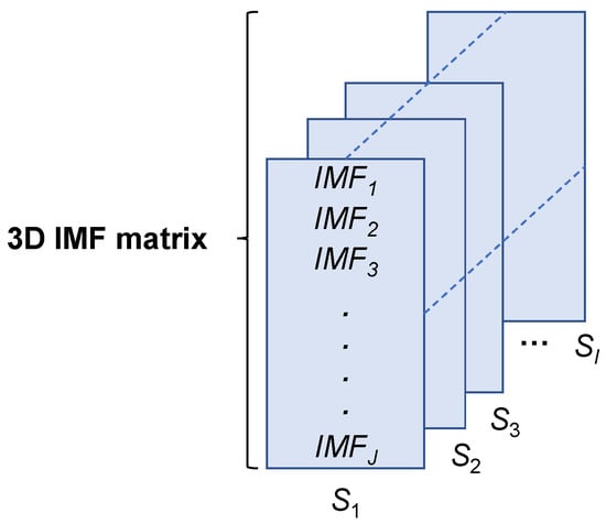 where [λ1, λ2,…, λI] are a set of learnable weighing parameters that determine the importance of each IMF sequence. The weighting parameters [λ1, λ2,…, λI] are usually initialized as average weighting factors, i.e., [1/I, 1/I, …, 1/I], to prevent learning with bias. As shown in Figure 3, the first and second dimensions of the constructed 3D IMF matrix reflect the time-domain and frequency-domain information, respectively, while the third dimension reflects the information at different scales.