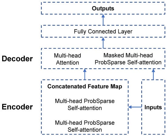 The informer model consists of an encoder, a decoder, and a fully connected layer output. The specific model structure is shown in Figure 4. The encoder receives a long sequence input and obtains feature representations through a ProbSparse self-attention module and self-attention distillation module. The decoder receives the long sequence input and completes the learning and semantic understanding of encoded features through a multi-head attention module. Finally, the target is predicted and output directly through the fully connected layer.