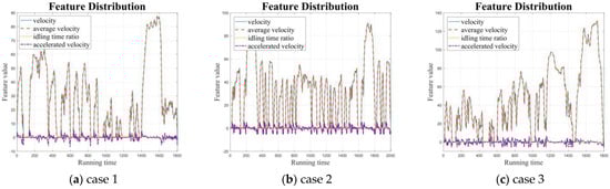 The experiment used car driving data from three different scenarios, with a total of 60 h of speed signals. The signal acquisition process covers different time periods and road conditions to ensure the comprehensiveness and representativeness of the experimental data. Complex urban road conditions, rural roads, and rugged paths are considered in the experiments. Driving behavior is usually continuous to ensure predictability. Specifically, to ensure the accuracy and reliability of the data, the sampling frequency is set to 1 Hz, which means a total of 216,000 driving sample points have been collected. The driving signal categories include velocity, average velocity, idling time ratio, and accelerated velocity. Some examples of feature distributions in the vehicle motion process are shown in Figure 5.