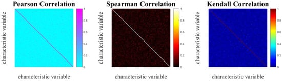The correlation between feature distributions is shown in Figure 6. Linear and nonlinear correlations, including Pearson, Spearman, and Kendall correlations, are calculated to observe the interrelationships between features. It can be observed that almost all the correlation measures among the features do not exceed 0.5 except for the autocorrelation on the diagonal, which shows a weak overall correlation. This means that the redundancy of feature is not significant and thus does not require the use of dimensionality reduction methods such as principal component analysis (PCA) for preprocessing. In contrast, the correlation under nonlinear measures like Spearman is more pronounced than that under linear measures. The vast majority of features between signals are not directly related, and deep learning models are needed to mine the underlying expert knowledge and construct potential mappings.