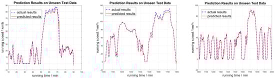 Then, we compare the performance of a series of methods for predicting the vehicle speeds, in terms of inference accuracy and efficiency, including XGBoost [], fuzzy Markov chain [], NARX [], LSTM [], 1D CNN [], and CNN-LSTM hybrid model []. The XGBoost [], fuzzy Markov chain method [], and NARX [] use the default parameter settings of the machine learning toolbox. LSTM [] is composed of an input gate, forget gate, cell, and output gate. Traffic congestion degree, road type, single travel distance, and speed limit are fed into the input gate, while the historical state information is fed into the forget gate. The hyper-parameter settings include: a dropout rate of 0.5, learning rate of 0.001, MAE loss, Adam optimizer, epoch of 100, and batch size of 1734. The 1D CNN model consists of one input layer, three convolutional layers, three max-pooling layers, one fully connected layer, and one output layer; all the convolution kernels are set to one dimension. The number and size of convolution kernels in the three convolutional layers are 256 × 1 × 3, 128 × 1 × 3, and 64 × 1 × 3, respectively. The hyper-parameters adopt the default settings under the classic AlexNet architecture. In CNN-LSTM, a spatial convolution model and an LSTM are connected in parallel, in which the CNN is composed of a contracting path, following the typical architecture of a convolutional network, and an expansive path. The learning rate equals 0.003, the L2 regularization coefficient equals 0.001, and other parameters are default parameters.