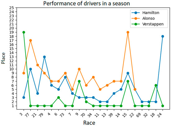 In addition, data were collected on weather conditions for past races, such as ambient temperature, humidity, wind speed and direction, and the presence of rain. These data are crucial to understanding how weather conditions can affect pilot performance and how it can be factored into the prediction model [32]. The results of the qualifying sessions leading up to the races were recorded, including each driver’s starting grid position. These results are important indicators of the performance of the pilots and can be used as a relevant predictor variable in our model.