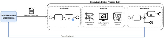 With the creation of DTs for process-driven systems, also referred to as digital process twins (DPTs), organizations gain valuable insights into their operations, enabling them to make decisions, optimize their performance, and predict possible outcomes based on the data coming from both the process model and the physical system [5]. Therefore, a DPT can both permit developers and end-users to interpret the behavior of a system and facilitate the interpretation and analysis of data. At the same time, a DPT can allow the exploration of various designs and operational alternatives related to the behavior of the whole system [6].