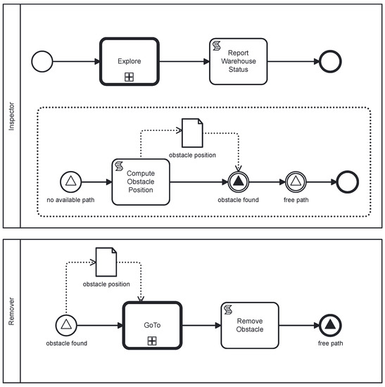 To represent the xDPT of the scenario, we followed the guidelines presented in [9]. This resulted in the BPMN collaboration diagram depicted in Figure 3, where each robot is represented as a pool. The Inspector starts its mission with a call activity that corresponds to the exploration of the place. During this mission, it can find an obstacle blocking its way. This event is handled by an event sub-process in which the robot computes the obstacle position, sends it as a signal event, and, finally, moves to an idle state waiting for a free path. Once the exploration of the whole warehouse is finished, the robot performs the reporting of the warehouse status, by means of a script task, and ends its execution. Meanwhile, the Remover robot is triggered by a signal start event when the Inspector sends the position of an obstacle. So, it first reaches the position, represented as a call activity, and then performs the script task corresponding to the obstacle removal. Its mission ends with the sending of a signal stating a free path.
