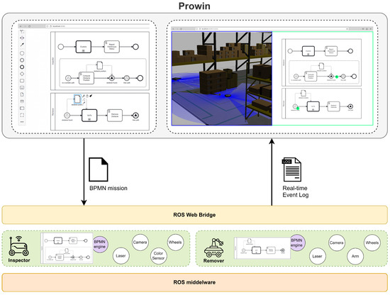 Once the process model is sent to the ROS network, the BPMN collaboration is split based on the robots in the system. Therefore, each robot receives the process model corresponding to the mission it should perform and exploits the built-in BPMN engine to interpret the BPMN elements and consequently perform a mission. During the system execution, the BPMN engines share with the Prowin tool real-time event logs representing the current element enacted by the engine. Notably, the connection between the ROS network and Prowin is enabled by the ros2 web bridge (https://github.com/RobotWebTools/ros2-web-bridge, accessed on 3 February 2023), i.e., a package that exposes the messages exchanged in the ROS network, so that it is possible to access robotic data from a web interface.