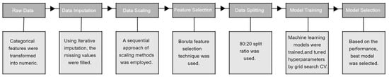 An experimental study was conducted on the UCI CKD dataset, where the categorical features were encoded. The missing values were addressed using alternative imputation techniques. A novel sequential approach was implemented for data scaling, involving robust scaling, z-standardization, and min–max scaling in that order. To perform feature selection, we utilized the Boruta algorithm. The dataset was divided into training and testing sets using an 80:20 ratio. For constructing the models, we employed ML techniques such as k-nearest neighbor and Gaussian NB. To optimize the model parameters, a grid-search CV was utilized. All preprocessing, visualization, and analysis tasks were carried out using Python programming.