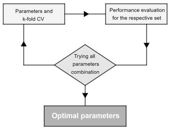 Hyperparameter optimization is a critical step in ML to optimize the model performance by selecting the best combination of hyperparameters. In our study, we employed the widely used technique of grid-search CV. This approach systematically explores predefined grids of the hyperparameter values, evaluating the model’s performance for each combination using CV. By exhaustively searching through the hyperparameter space, it allows for a comprehensive exploration and selection of the optimal hyperparameter configuration [36,37]. The workflow of grid search CV for the selection of the hyperparameters is illustrated in Figure 3.