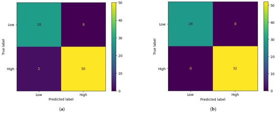 In Figure 4, the confusion matrices are presented, depicting the performance of the models. Table 3 provides the optimal hyperparameters obtained through the grid-search CV, along with the performance metrics including the accuracy, precision, recall, and F1-score. It shows that the k-nearest neighbors model achieved a 100% accuracy, precision, recall, and F1-score, indicating excellent performance.
