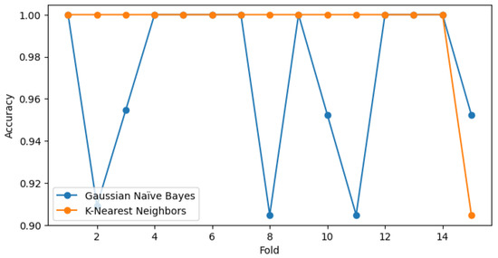 To assess the generalization capability of the trained models, a rigorous 15-fold CV technique was employed. The results, as depicted in Figure 6, illustrate the accuracy of both models on each fold, providing valuable insights into their performance. The k-nearest neighbor algorithm demonstrated remarkable consistency across diverse folds, achieving an exceptional accuracy of 99.37%. This high score highlights the model’s impressive performance and robustness, indicating its ability to generalize well to unseen data. In contrast, the Gaussian NB achieved a slightly lower CV accuracy of 97.05%.