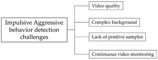 Impulsive aggression is characterized by abrupt reactions to situations that are more emotional than is needed for the situation, in order to cause harm to another person. People frequently unconsciously imitate other people’s actions in a phenomenon known as emotional contagion [1]. A group could unknowingly be affected by a group member, who could cause the entire group to feel certain emotions, leading to misbehavior. Hatfield et al. [2] traced the hysterical emotional contagion process. They inferred that negative emotions have a more emotional impact than positive ones. Moreover, Slutkin and Ransford [3] add that impulsive aggressive behavior is similar to a contagious disease in many ways, including spreading. Impulsive aggressive behavior can occur in numerous situations, such as a violent outbreak of riots among the masses. Once it is detected, its transmission between people might be prevented. The detection of such behaviors at their initial spark breaks their chain reaction, leads to public safety decisions, and is a key to security. Detecting impulsive aggressive behavior in surveillance footage encounters challenges, as shown in Figure 1.