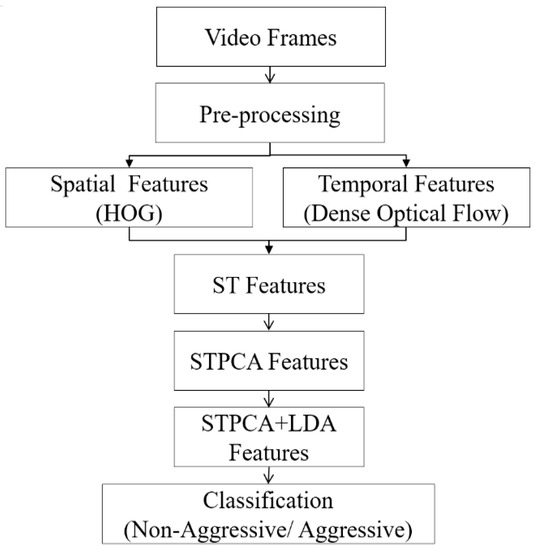 Aggressive behaviors are related to the shape of the human body and the motion information of the moving body parts during actions. So, the spatial and temporal features complement each other in this case. Therefore, a combination of two feature-extraction techniques into a single spatiotemporal (ST) descriptive vector is utilized here. Using the HOG, Dalal and Triggs [47] captured the spatial shape of human bodies during the action and the dense optical flow; Farnebäck [48] focused on the motion magnitude and direction of moving body parts. However, each of these features requires a preprocessing step for reducing their problems and extracting discriminative features.