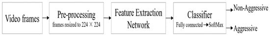 The learned features were obtained after training the deep-learning model for classification. Training a deep learning model requires lots of training data, powerful GPUs, and memory space to achieve optimal performance. Training a deep-learning model from the starting point is challenging. As a result, a pre-trained model of a similar problem expedites the training process. It is known as the transfer learning method. It involves modifying the last fully connected layer to represent the new classes and the remaining layers of the architecture extract features for the new related problem. For impulsive aggressive event detection, two CNN architectures were used—the GoogleNet model [52] and the ResNet model [53]—which have been shown to be more robust than other models [54]. The learned-feature results of the GoogleNet model of 22 layers deep were compared to the ResNet model of 50 layers deep, both of which were pre-trained on the ImageNet dataset. Figure 3 represents the learned-feature model, where the input frames were resized to 224 × 224 pixels to fit the model input, and the models were trained for 35 epochs using SoftMax as the activation function, cross entropy as the loss function, and Adam as the optimizer.
