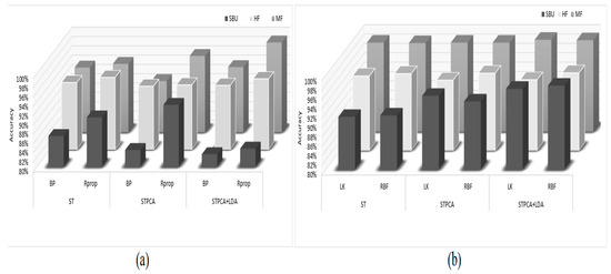 For classification, Table 1 shows the results of the MLP backpropagation (BP) learning techniques vs. those of resilient backpropagation (Rprop), whereas Table 2 shows the results of the support vector machine (SVM) classifier using a linear kernel (LK) vs. radial bases kernel (RBF). The best accuracy for each benchmark is in bold and underlined in Table 1 and Table 2, to define the suitable learning. From the results, we deduced that the MLP with Rprop performed better than the BP, and the SVM with the RBF kernel performed better than the linear kernel.
