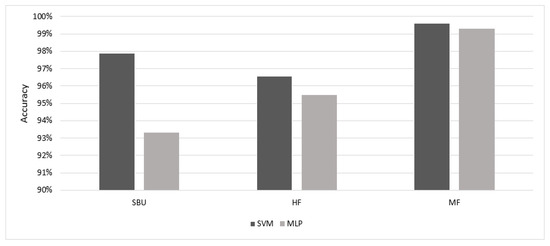 Figure 5 shows the comparison of results of the ST, STPCA, and STPCA + LDA utilizing the two machine-learning classifiers. Figure 5a represents the accuracy results of the extracted features using the MLP classifier. From the figure, the ST features had the best accuracy for the HF dataset, while the STPCA + LDA features had the best results for the MF datasets using MLP. Figure 5b shows the results of the SVM classifier for recognizing impulsive aggressive events of the extracted features. The results show that STPCA + LDA features performed better on the three benchmark datasets. Figure 6 illustrates the best accuracy results of both classifiers for the three datasets. Although STPCA + LDA did not perform best using the MLP classifier for the SBU and HF datasets, it achieved the best results using the SVM classifier when compared to the other MLP results, indicating its superiority among the extracted features. Other evaluation parameters, such as the total training time (TR_t) for computational cost comparison, F1 score, precision (Pr), and true-positive rate (TPR), were further used for the assessment of extracted features, as shown in Table 3, using the SVM classifier with radial bases kernel (RBF). The assessment parameter shows the superiority of STPCA_LDA features on both accuracy and computation cost.