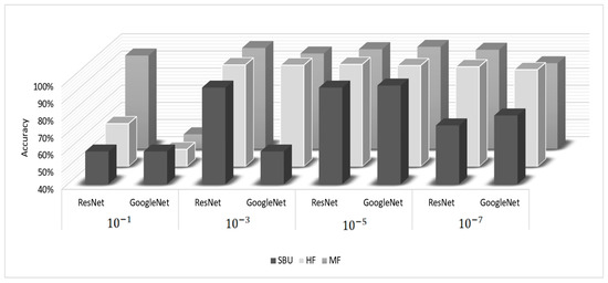Figure 7 shows the results of recognizing impulsive aggressive behaviors of the learned features using ResNet and GoogleNet models under different learning rates. It demonstrates the best accuracy obtained with the learning rate of both models for the three benchmark datasets. The further evaluation matrices average training time per epoch (ATR_t), ACC, F1 score, Pr, and TPR, were used for the model assessment, as shown in Table 5 with the learning rate. From the results shown, the GoogleNet model had a higher performance than the ResNet model for the SBU and the MF datasets, while the ResNet performed better for the HF dataset.
