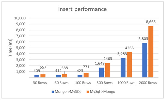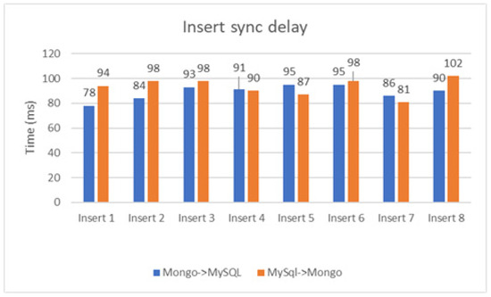 For a change to be carried out from MongoDB to MySQL, the average time in milliseconds obtained by repeating, is 89 ms; the other way, from MySQL to MongoDB, it is 93.5 ms. The time obtained as a result of the individual tests performed is shown in Figure 4. For the times obtained, which are under 100 milliseconds, it can be said that no latencies that can be felt by a user were introduced for the vast majority of existing applications.