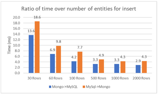 The ratio between the time to synchronization and the number of rows/entries, as can be seen in Figure 7, decreases depending on the number of entries. For a few entries, we have an unfavorable ratio and then the performance increases and the ratio reach a value of 2.9 ms/entry for MongoDB to MySQL replication, and for MySQL to MongoDB replication, the ratio reaches a value of 4.3 ms/entry.