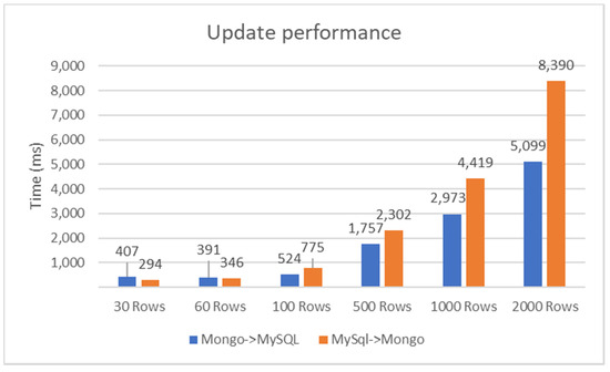 Performance was tested for the following operations: insert, update and delete. The tests were two-way, i.e., the performance of replicating changes from MongoDB to MySQL was measured as well as the performance of replicating changes from MySQL to MongoDB. All tests were performed with 6 data sets. The essential difference between the data sets was given by the number of records. The tests were carried out with 30, 60, 100, 500, 1000 and 2000 records, respectively. In the code, these values are found in an array called testSizes. The testing procedure is detailed in Algorithms 1–3 for each of the operations tested. The tests follow the same pattern: the data are prepared, the operation is executed in the first database, and a timer is started. When the synchronization is complete, as noted by a continuous polling of the second database, the timer is stopped and the result is printed. Basically, the time-to-sync that is recorded is the time between the end of the execution of an operation in the first database and the moment its effect is mirrored in the second database. The polling interval is set to 20 ms using the static variable, POLLING_SLEEP_TIME_IN_MS. The tests were run multiple times to ensure that the results were consistent.