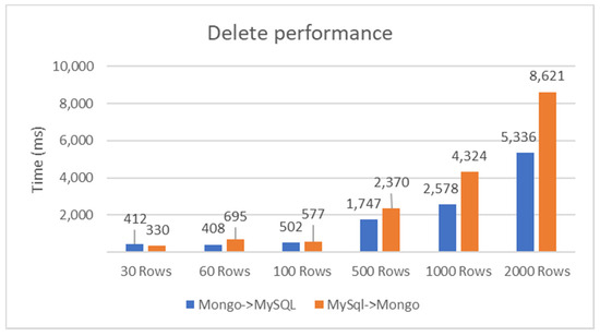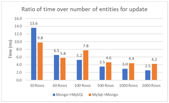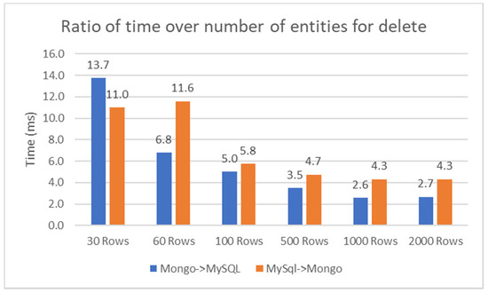 Analyzing the results shown in Figure 10 for the deletion operation, it can be seen that the synchronization times obtained in the case of the deletion operation are similar in both directions for MySQL and MongoDB. Thus, we can say that a favorable result was obtained. This ensures that the synchronization system described in this paper can be used in a real-world application. For a small number of entries, i.e., 30 or 60, the times are similar. This shows that there is a minimum required processing and deletion time. The ratio between the time to synchronization and the number of entries decreases according to the number of entries, as shown in Figure 11. For a few entries, we have an unfavorable ratio but afterwards, the performance increases and tends towards 2.7 ms/entry for MongoDB to MySQL replication and to 4.3 ms/entry for MySQL/MongoDB.