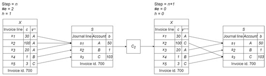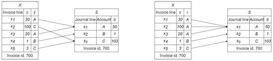 - Goal Definition: the goal is achieved when the search leads to a node where, by grouping the invoice rows according to the pseudo-labels in the state vector and summing the prices, the same aggregate amounts are found in S, just as in the left-hand panel of Figure 5;