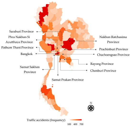 Road Traffic Accidents frequency in Thailand by Provinces from 2020–2022.