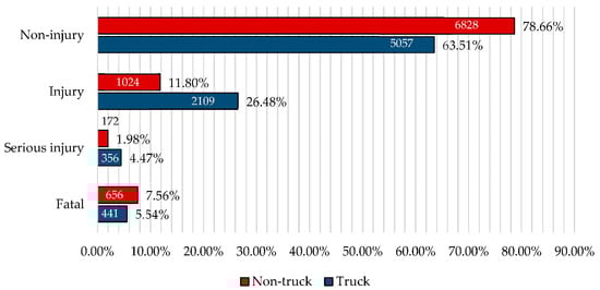 Throughout the preceding year, the prevalence of road accidents in Thailand has been notably concentrated within provinces classified as industrial zones, as visually depicted in Figure 1. These zones encompass a diverse range of spatial categories, encompassing industrial areas, industrial estate parks, and comprehensive industrial zones. Delving further into the accident data for the industrial province regions during the period spanning 2020 to 2022, a striking finding emerges, indicating that injuries and fatalities collectively averaged a substantial 22.11% []. This statistical revelation underscores the inherent challenges of navigating through complex driving conditions in densely populated areas, which inherently magnify the inherent risk of accidents. Complex driving conditions in densely populated areas significantly escalate the risk of accidents. Notably, collisions involving trucks pose a higher threat than those not involving trucks, largely due to the trucks’ size and weight impeding swift braking in emergencies []. In 2021, data categorized by vehicle type indicated that truck-related accidents constituted 12.41% of all accidents []. When assessing the proportion of injuries and fatalities from truck-involved collisions in industrial zones, the figures are markedly higher compared to collisions not involving trucks (Figure 2). Consequently, the rate of injuries and fatalities from truck accidents ranks second in comparison to other vehicle types []. Given this significance, a detailed study of factors contributing to the severity of truck accident injuries and fatalities is essential for enhancing road safety.