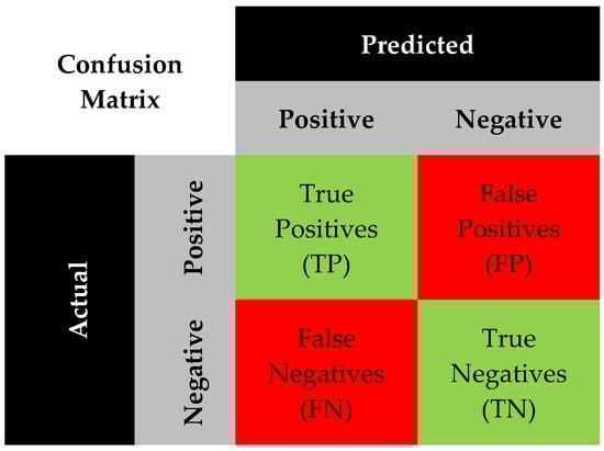 In this study, the accuracy (ACC), sensitivity (SNS), specificity (SP), precision (PRC), F1-score, and AUC were used as performance metrics for the prediction model of MARS. These metrics can be calculated from the confusion matrix, as shown in Figure 4. The confusion matrix consists of four components, the count of true positives (TP), count of true negatives (TN), count of false positives (FP) and count of false negatives (FN) [].