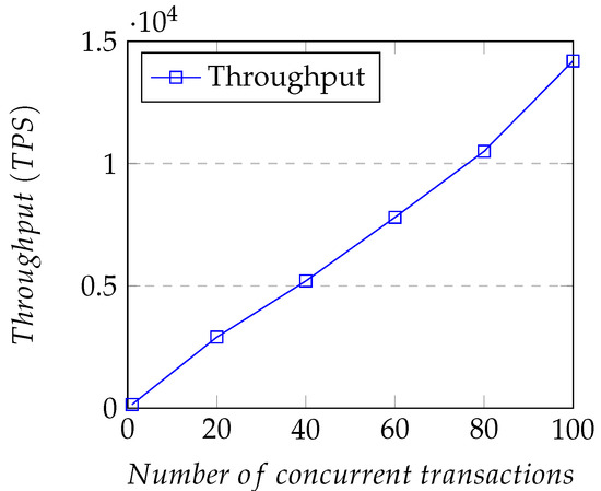 The throughput plot Figure 4 demonstrates an excellent linear scalability in performance. As concurrent transactions increase from 20 to 100, the overall throughput handled by the network scales up linearly from 2900 TPS to 14,200 TPS. This shows the blockchain implementation is able to achieve consistently high throughput while maintaining low latency, even at workloads up to the projected peak. The network sustains over 14,000 transactions per second at 100 concurrent transactions, indicating robust performance even at the maximum anticipated load. In summary, the low and stable latency combined with the excellent scalability in throughput indicates an efficient blockchain implementation that can deliver high performance under diverse real-world operating conditions. The results validate the system’s ability to handle peak transaction loads while maintaining fast confirmation times.