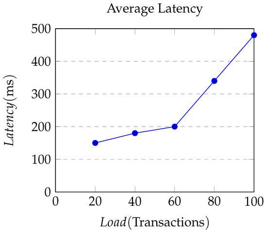 The latency plot in Figure 3 shows that as the transaction load on the network increases from 20 to 100 concurrent transactions, the average latency for a transaction to be committed rises from 150 ms to 480 ms. However, the latency remains under 0.5 s even at peak load. This indicates that the blockchain network can handle increased volumes without much deterioration in transaction confirmation times. A slight upward trend is expected—at higher loads with more transactions contending for confirmation, latency tends to increase. However, an average latency of <500 ms is still quite low for 100 concurrent transactions.