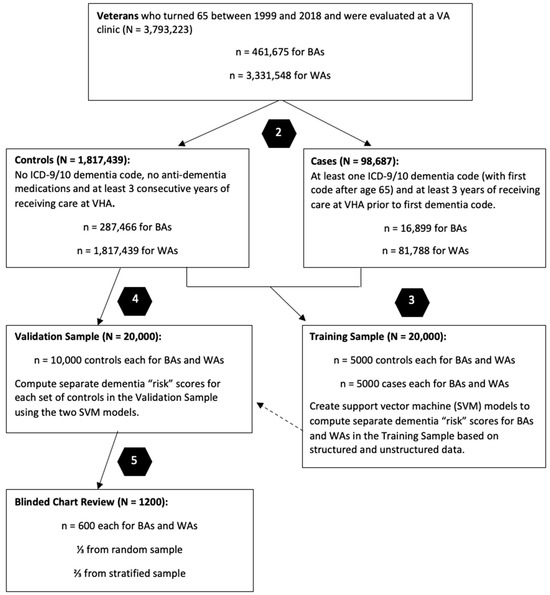 After receiving IRB approval, we created a cohort of cases (i.e., Veterans with an ICD-9/10 dementia code) and controls (Veterans without any ICD-9/10 dementia codes) from the CDW by selecting patients who turned age 65 between 1999 and 2018, who were previously evaluated at a VA clinic and who were identified as BA or WA in their EHRs (see Figure 1). The selected Veterans were followed until 12 September 2018, until diagnosis (cases) or until censoring due to an absence of records (controls).