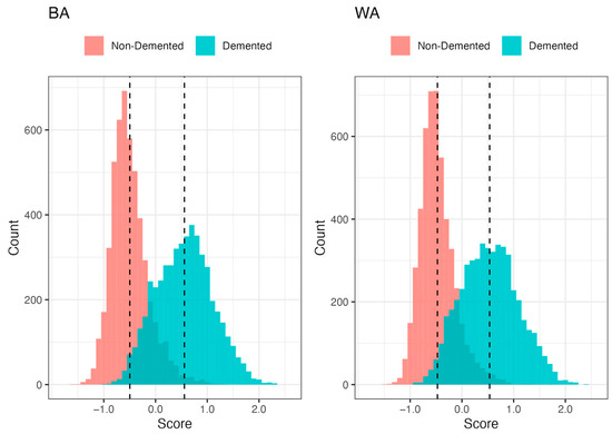 Distribution of scores by dementia status and race (BA: Black American; WA: White American) for Veterans in the Training Sample (n = 5000 in each dementia status group for each race). Dashed lines represent the means of the distribution.