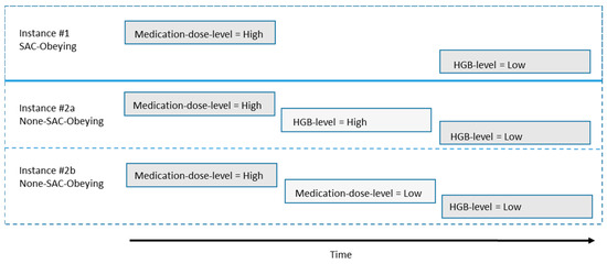 Note that experts, especially medical experts, often expect a meaningful frequent temporal pattern to convey some potential causal relationship, such as a High dose of a medication reducing the level of Hemoglobin, in the case of the temporal pattern depicted in Figure 1, Instance #1 (SAC-obeying TIRP). The fact that the true state of affairs is such that it rules that possibility out, as in the case of Instance #2, since in the patient’s record there exists a High-Hemoglobin period after the administration of the medication, would not be expected by a clinician when hearing the description of the frequently discovered pattern as “<Medication-dose-level = High> Before <Hemoglobin [HGB]-level = Low>”. Nor would this clinician expect that there might be an additional episode of medication administration, but with a Low dose, before the High Hemoglobin value. Given that description, from the point of view of a clinician, Instance #2 and Instance #3 lack semantic coherence.