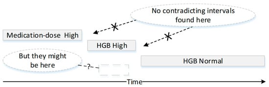 Figure 4 considers the TIRP “<Medication-dose = High> before <HGB = High> before <HGB = Normal>”; the relationship between the medication administration time interval and the third time interval is also before: “<Medication-dose> before <HGB = Normal>”, but the two symbolic time intervals participating in this relation are not successive in the SSAC sense, since they do not follow each other in the lexicographic ordering.