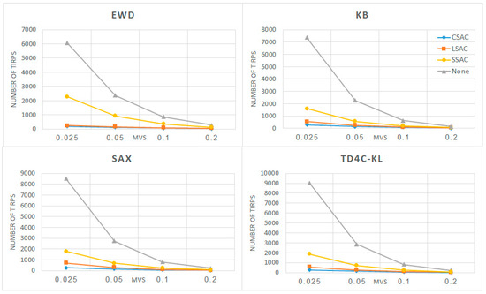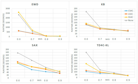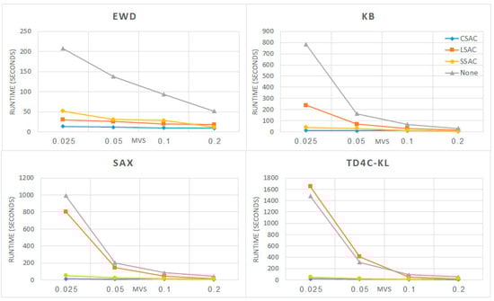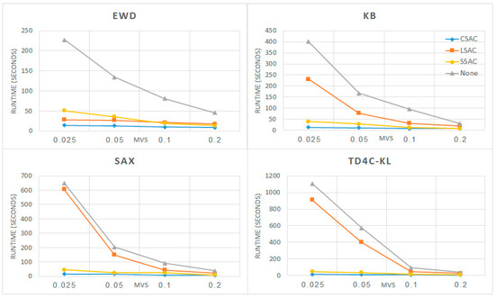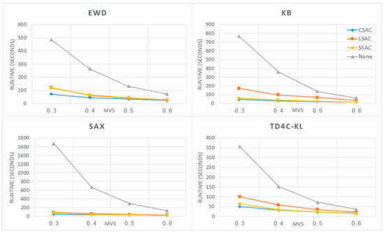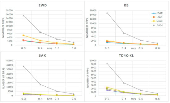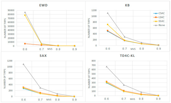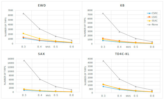The SAC is a stricter selection criterion for TIRPs discovery algorithms and many TIRP candidates might not be generated. Thus, our first hypothesis is that using the SAC (including the several versions we proposed) to discover TIRPs will generate fewer TIRPs than when not using the SAC for any given minimal vertical support, which is expected to lead to a shorter run time for the discovery phase of the TIRPs.