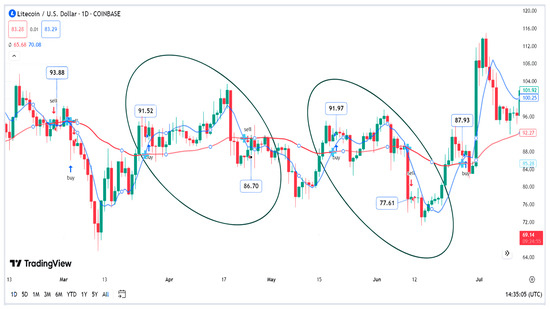 The crossovers between 20- and 50-days L-WMA indicator for LTC/USD trading. (The red line is for the short MA and the blue line is for the long MA, whereas the ovals show the areas of false signals) (using Tradingview.com, accessed on 8 November 2023).