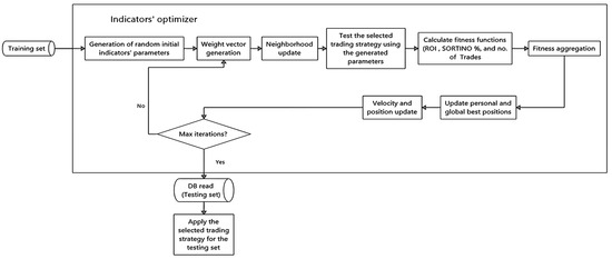 The proposed algorithm (Algorithm 1) is used to optimize the parameters of a set of four algorithmic trading paradigms over three objective functions. The optimization process is performed using the MOPSO/D algorithm, where the algorithm first initializes the particles’ positions, velocities, and personal and global best positions. Each particle represents a separate SP, such that is the position of particle at time , while is the velocity of particle at time . For the application at hand, the particles’ positions are the indicators’ parameters. Each particle is assigned a weight vector that is used for fitness aggregation purposes. The Euclidean distance between each pair of particles, or SPs, is calculated in order to determine the particles that lie in the same neighborhood.