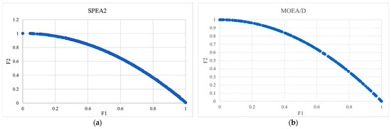 The AFV of each objective is calculated as the average of the fitness of the non-dominated solutions found during independent runs. Such that the total number of solutions are the number of non-dominated solutions found during each run multiplied by . However, the number of non-dominated solutions is not necessarily the same during each run. The results are available at https://drive.google.com/drive/folders/1V-bBCcs2L9XoOrXasHa4aowTf0oj0C8a (accessed on 23 September 2023).