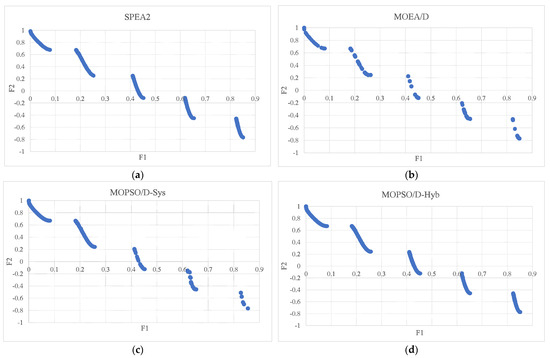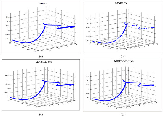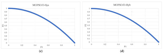 To evaluate the performance of the hybrid assignment mechanism (MOPSO/D-Hyb), the proposed algorithm is compared against both Pareto-dominance-based algorithms, i.e., SPEA2 [69] and decomposition-based algorithms, i.e., the original MOEA/D and MOPSO/D with systematic weight distribution (MOPSO/D-Sys). For fair comparison and to evaluate the effect of the hybrid strategy clearly without any external improvements (specifically the normalization effect), all the three decomposition-based algorithms are implemented using the non-normalized WTCH aggregation function. In this case, all the algorithm steps are the same as mentioned, except step 2.1 in Algorithm 1, which will be replaced with Equation (11).