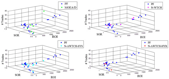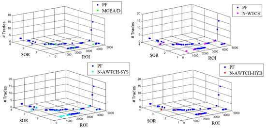 As noticed from the figures Figure 6 and Figure 7, the number of true PF points is limited that is due to many reasons. Among the factors that affect the number of true PF points is the relationship between the objectives, such that the objectives at hand are highly skewed. The second reason is the effect of the market changes during the period under study (i.e., the COVID-19 pandemic), such that a large number of parameter combinations are found to be non-sensitive to the market changes, generating either non-profitable trades or no trades. Moreover, some parameter combinations are found to generate the same trading signals.