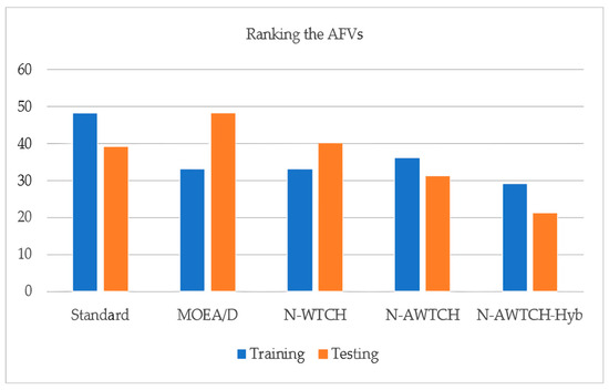 It is obvious from the figure that N-AWTCH-Hyb has the best ranking during both training and testing, followed by both MOEA/D and N-WTCH during training, and N-AWTCH-Sys during testing. As seen from the results, the proposed algorithm provided the best trading strategies as compared to the other counterparts.